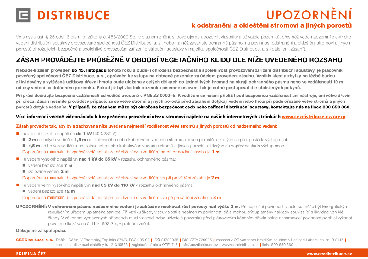 Upozornění k odstranění a okleštění stromoví a jiných porostů