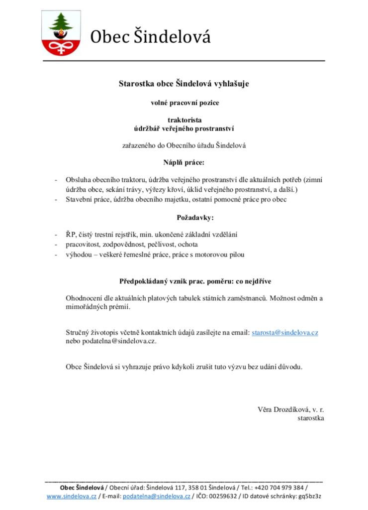 Volné pracovní pozice - traktorista, údržbář veřejného prostranství